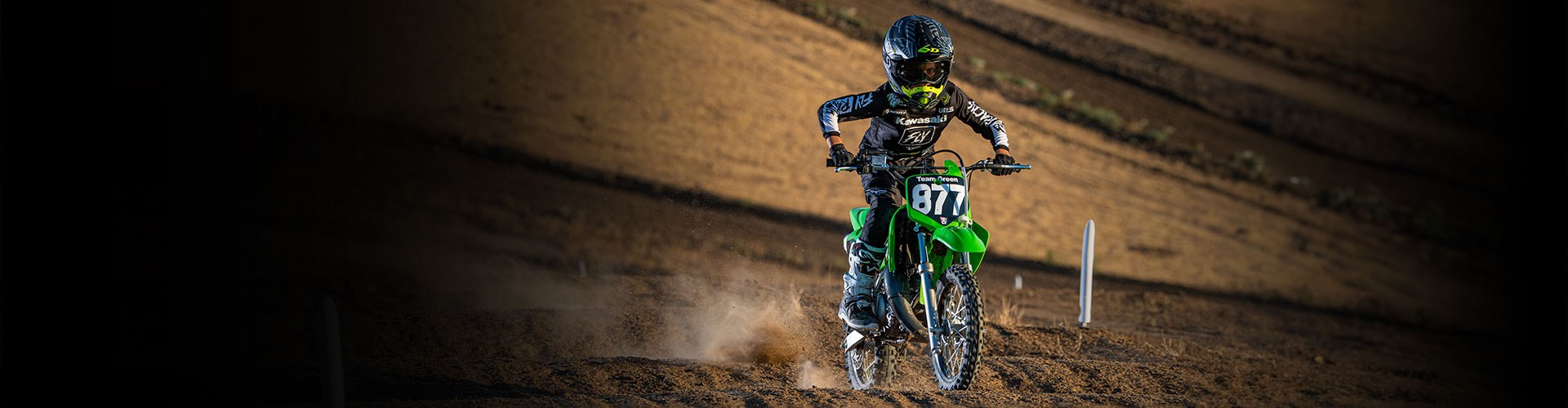 The KX65 motorcycle is the ideal dirt bike for introducing young racers to the competitive ranks of motocross. With a 64 cc engine, durable chassis and proven agility to turn lap after lap, the KX65 allows riders to gain experience and build skills on a dependable platform.
